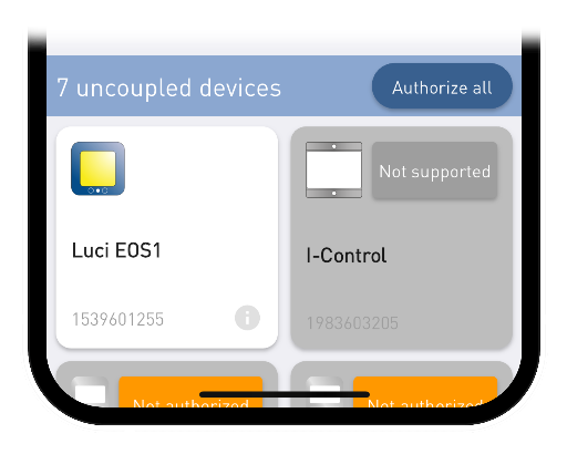 Um Änderungen an der Gerätekonfiguration vornehmen zu können, muss Ihr Konto zunächst beim Gerät autorisiert werden . Dazu können Sie auf die Gerätekachel tippen, um die Autorisierung zu starten. Um dies für alle abgekoppelten Geräte auf einmal zu tun, können Sie auf die blaue Schaltfläche „Authorise all“ (Alle autorisieren) neben der Überschrift